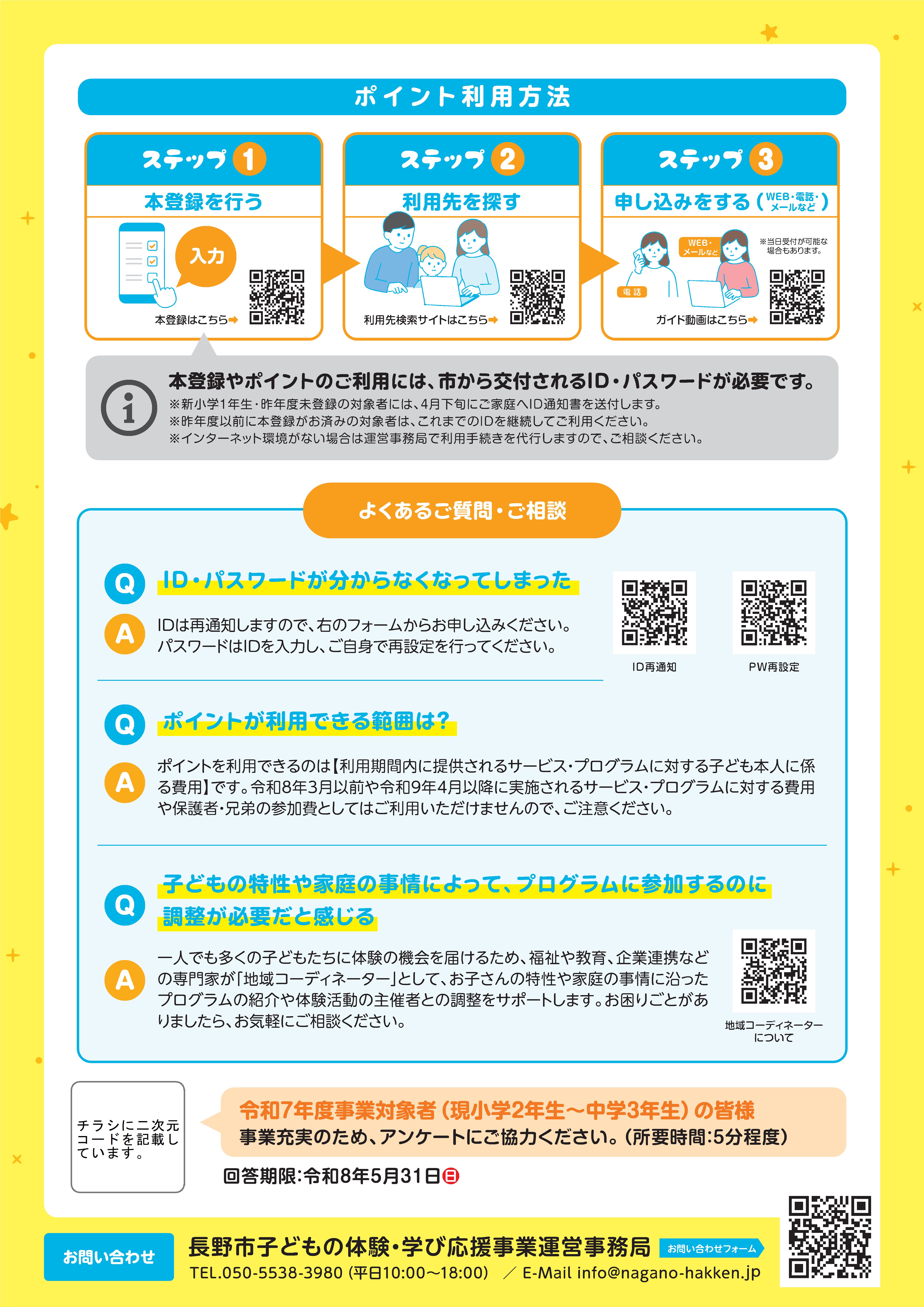 なお、新小学2年生~中学3年生で、昨年度以前に本登録がお済みのお子様がいるご家庭には通知が届きませんので、これまでのIDを継続してご利用いただくようお願いします。