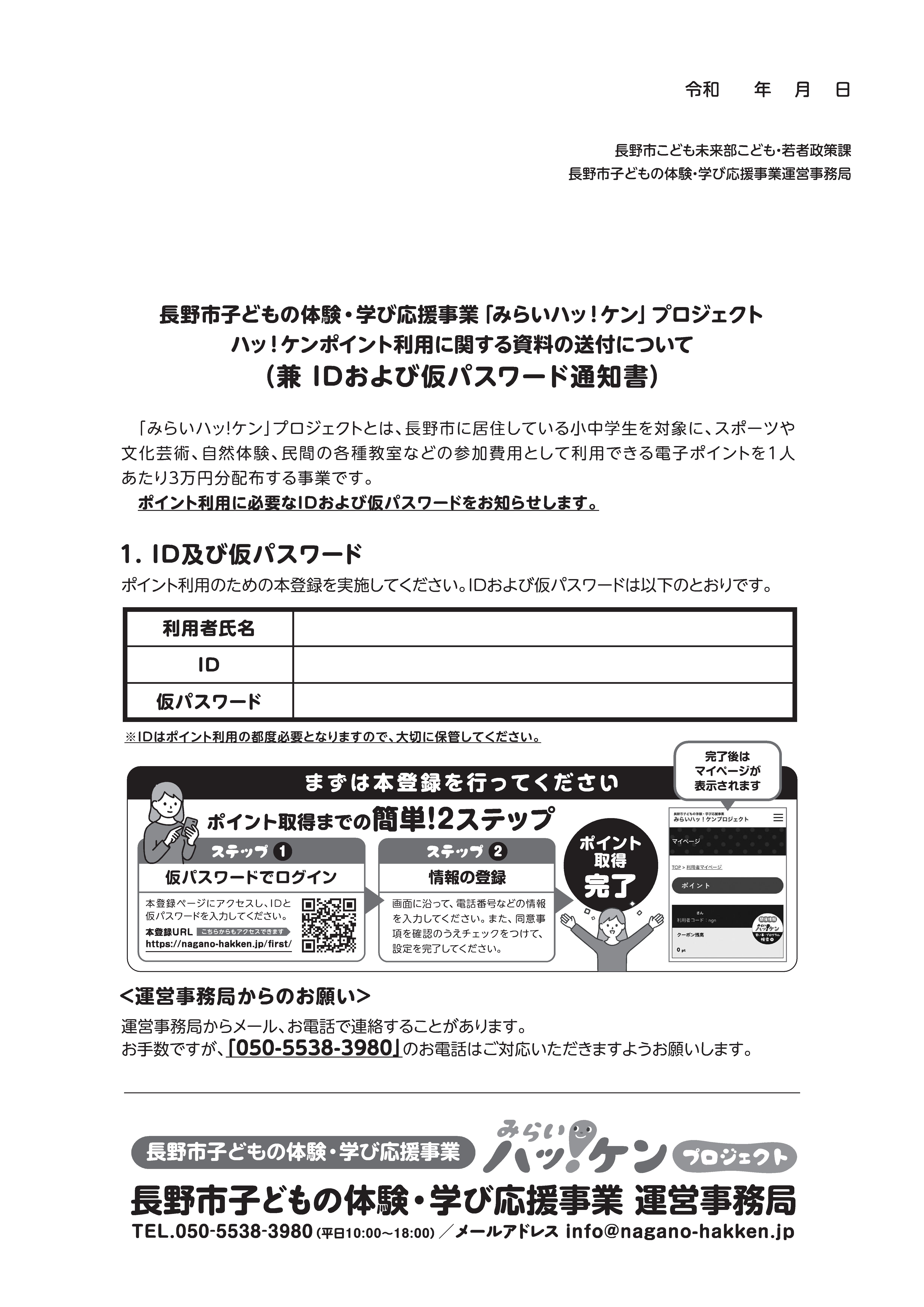 4/16(木)に、新小学1年生及び昨年度本登録をされていない対象のお子様がいるご家庭へ、IDおよび仮パスワード通知書とチラシを発送いたしました。対象のみなさまにお送りしている通知書とチラシは次のとおりです(実際の通知書には該当のお子様の情報が記載されています)。