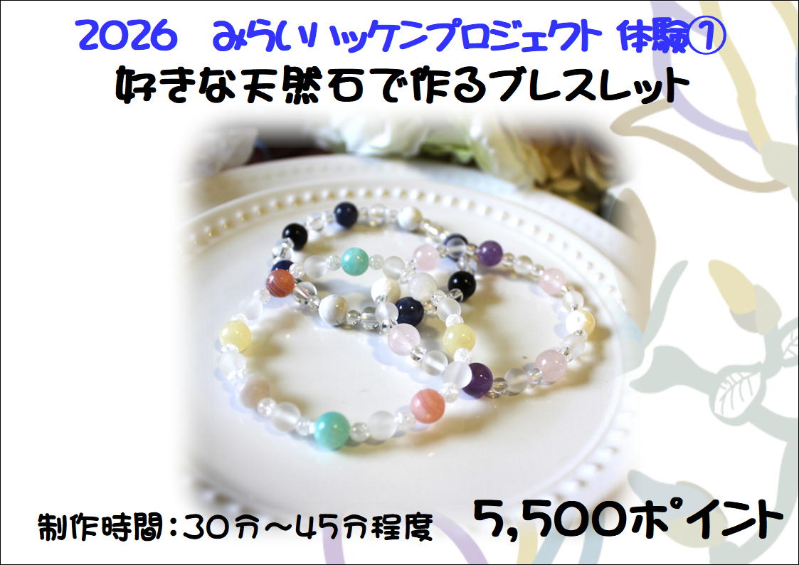 天然石ブレスレットの制作体験レッスンになります。こちらの体験をご希望の方は「①ブレスレット制作」とお知らせ下さい。