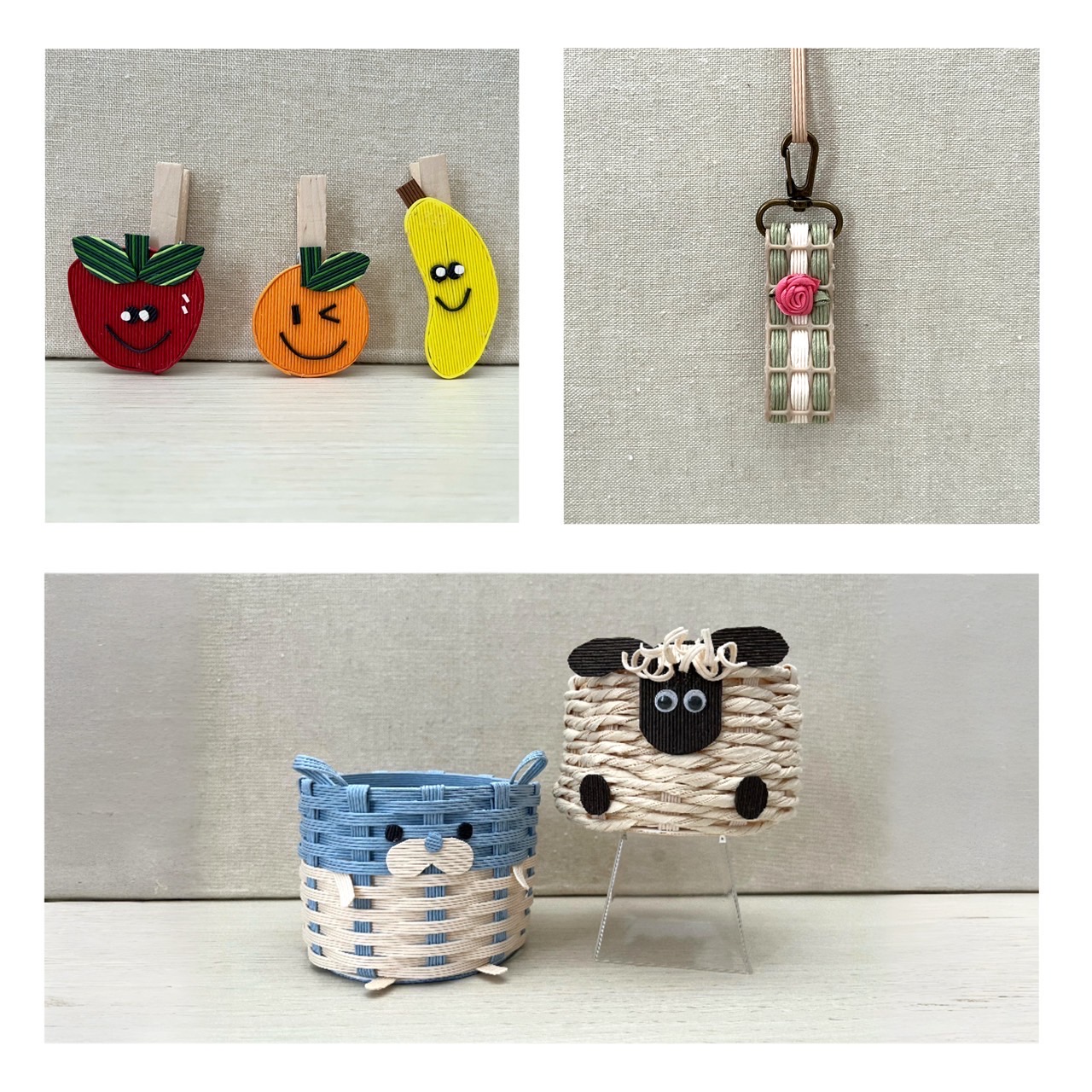 今回の体験は「キーホルダー作り」「動物のかご作り」「フルーツのクリップ・マグネット作り」です!