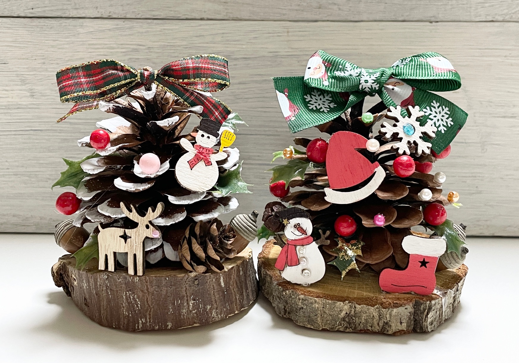 大きな松ぼっくりに飾りを付けて世界に一つだけのミニクリスマスツリーを作ります。