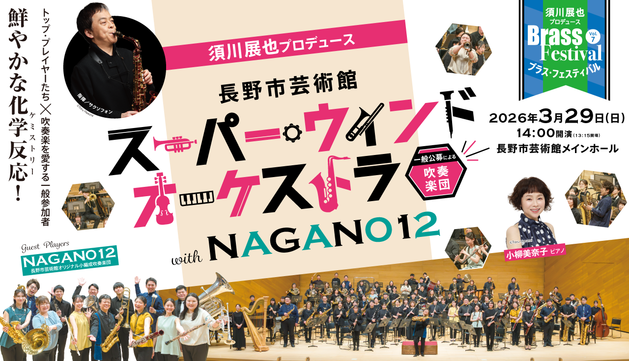 日本が誇る吹奏楽界のレジェンド、サックス奏者・須川展也が全身全霊で創り上げる、一日限りの一般公募による吹奏楽団スーパー・ウインド・オーケストラと、全員が長野県出身のプロ奏者からなる12名の吹奏楽団、夢の共演!!