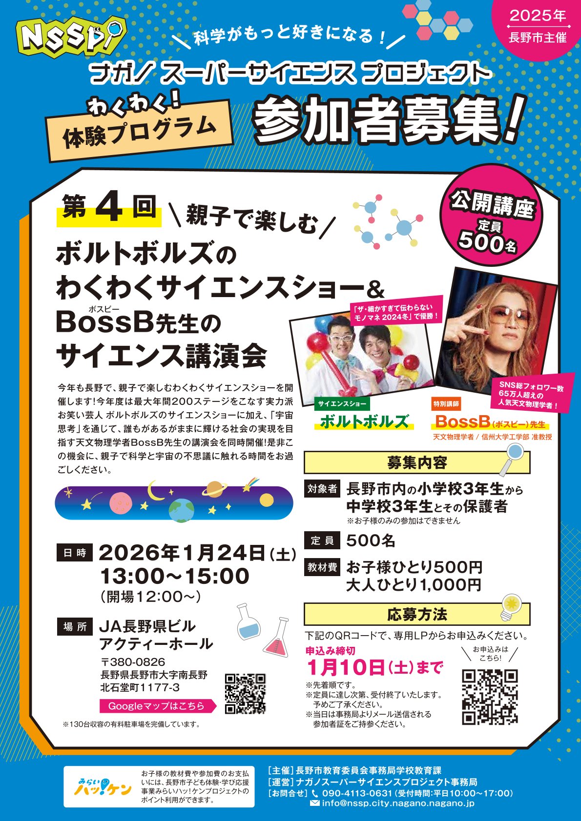 親子で楽しむ!ボルトボルズの わくわくサイエンスショー& BossB先生のサイエンス講演会