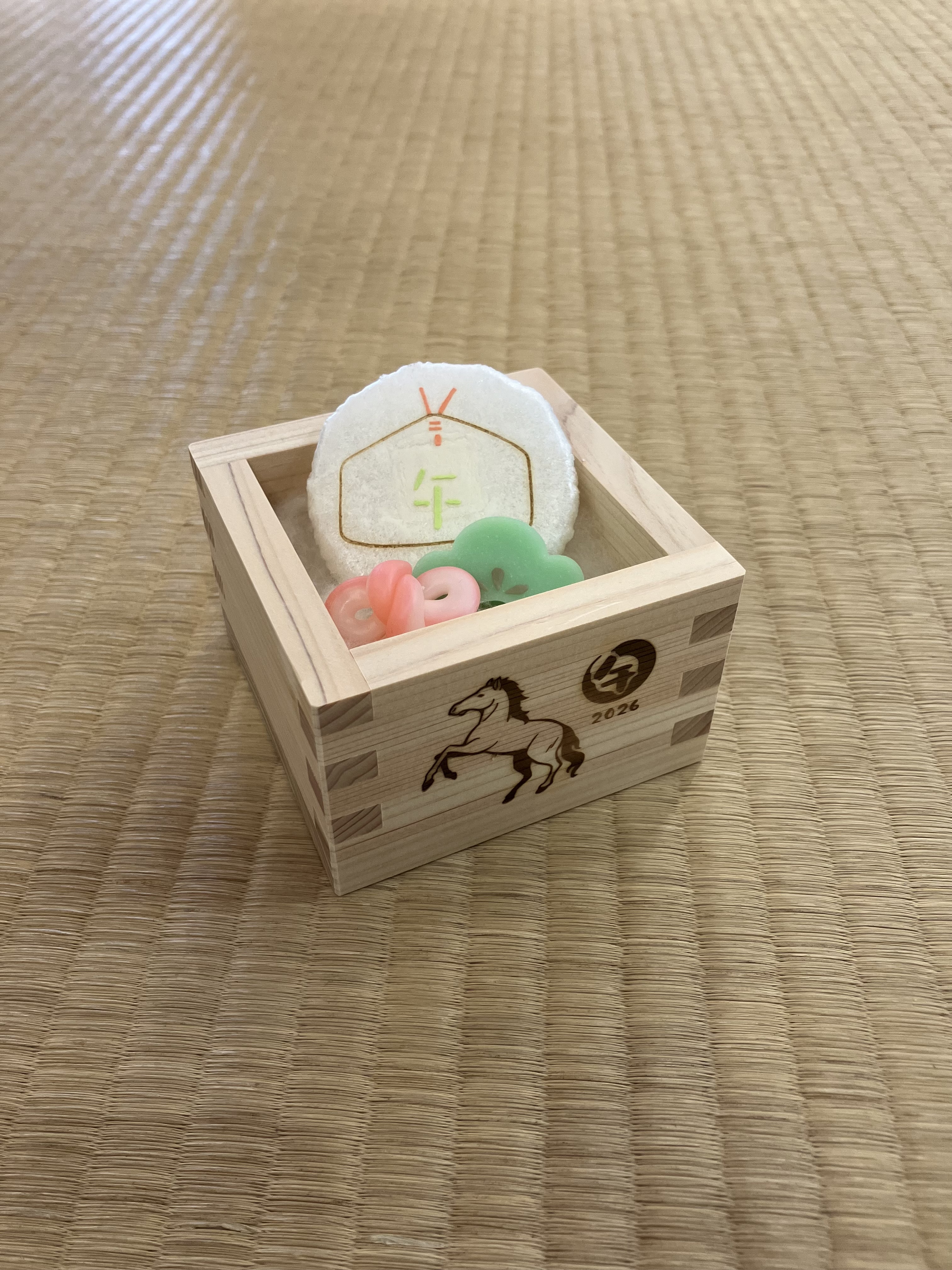 抹茶を点てるだけでなく、きれいな器で季節の和菓子もお召し上がりいただけます。1月はお正月の趣向のお菓子3種類が今年の干支「うま」の焼印が押された枡に入っています。