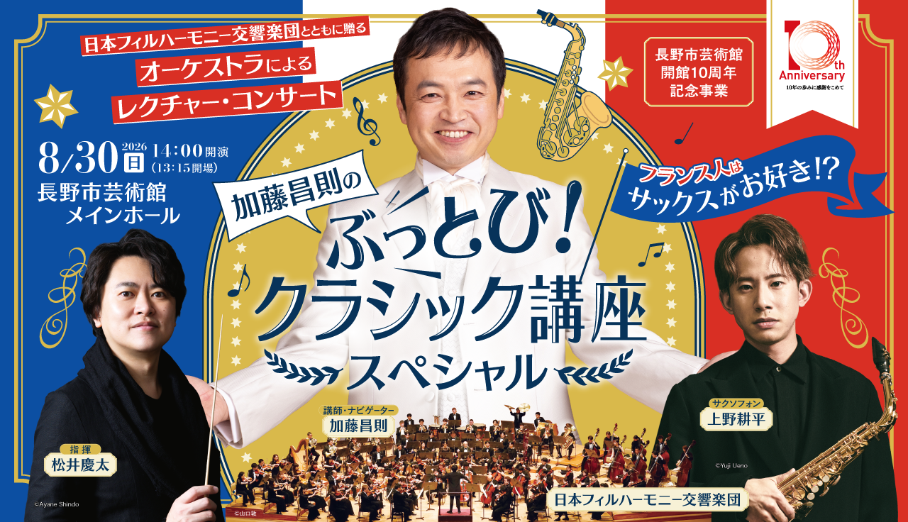 長野市芸術館初登壇となるマエストロ松井慶太氏と日本フィルハーモニー交響楽団、そして「水曜ひるまのクラシック・リサイタルシリーズ」に出演経験のある、人気実力ともに若手ナンバーワンのサックス奏者、上野耕平氏をソリストに迎え、オーケストラとサクソフォンの関係を深く分かりやすく掘り下げます。