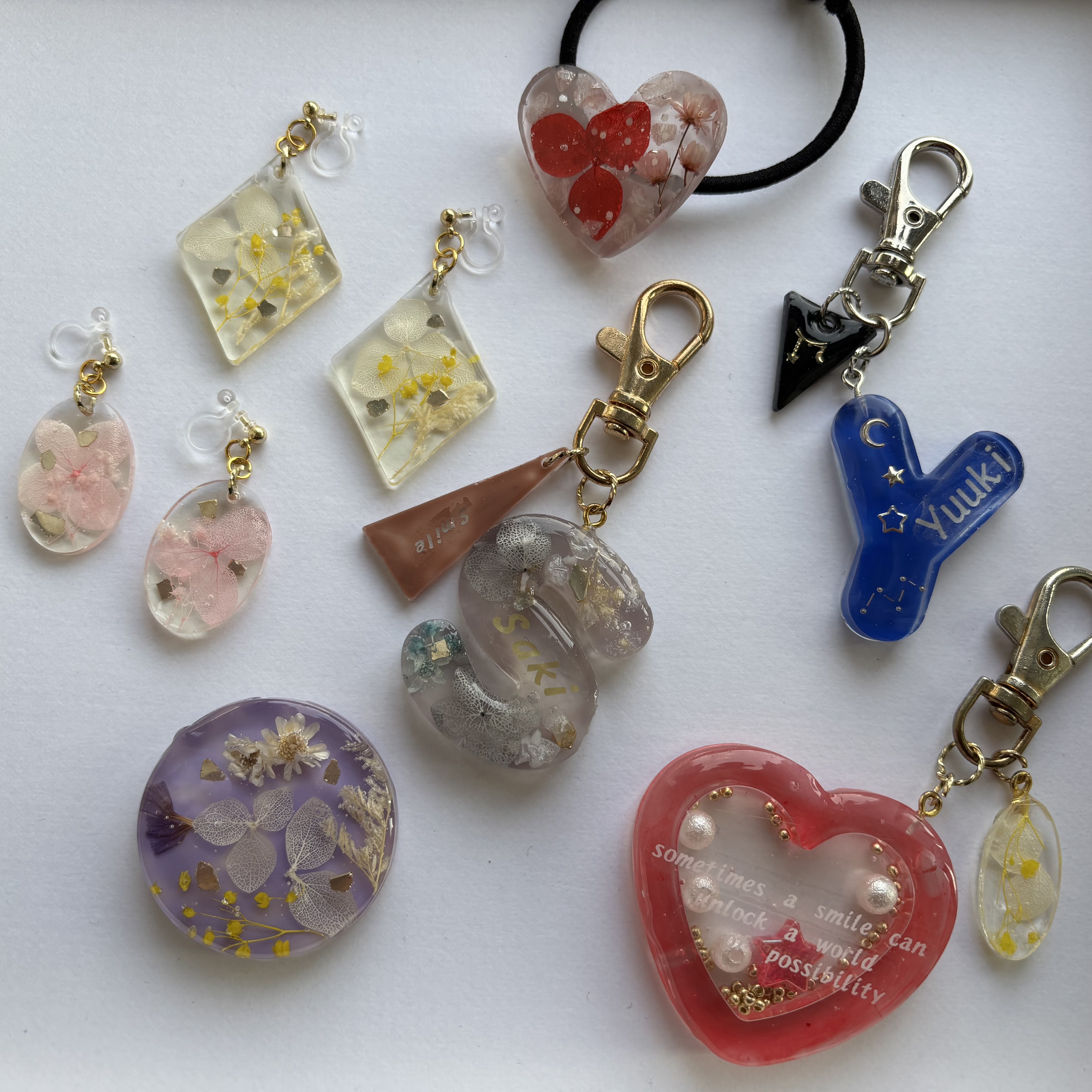 レジンでキーホルダー・イヤリング・ヘアゴム・ブローチの中から4点選んでつくることができます♪