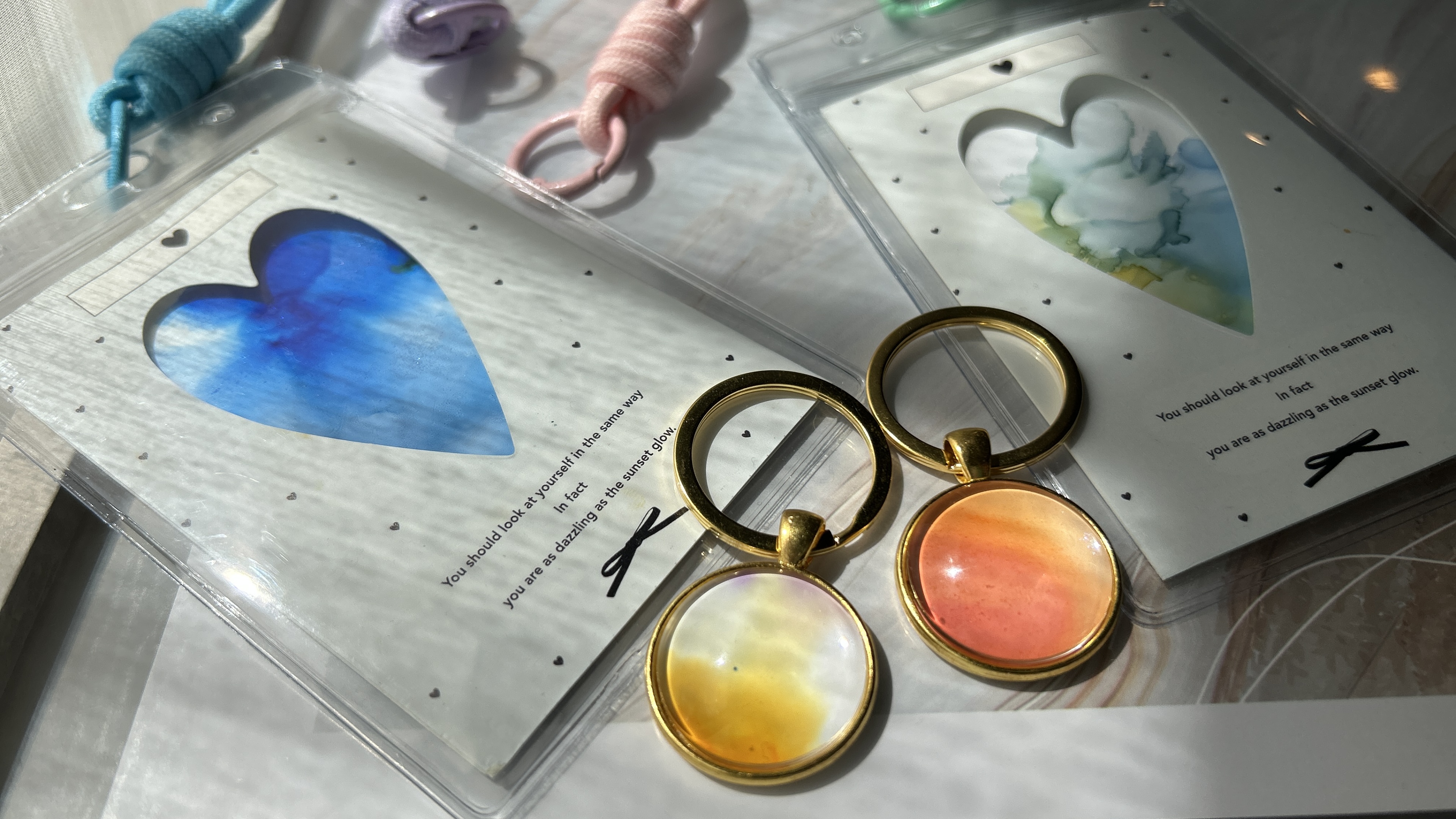 インクアートを楽しんだ後は、お気に入りの色や柄の部分を自分だけのカードホルダー、キーホルダーで持ち歩ける形にします。