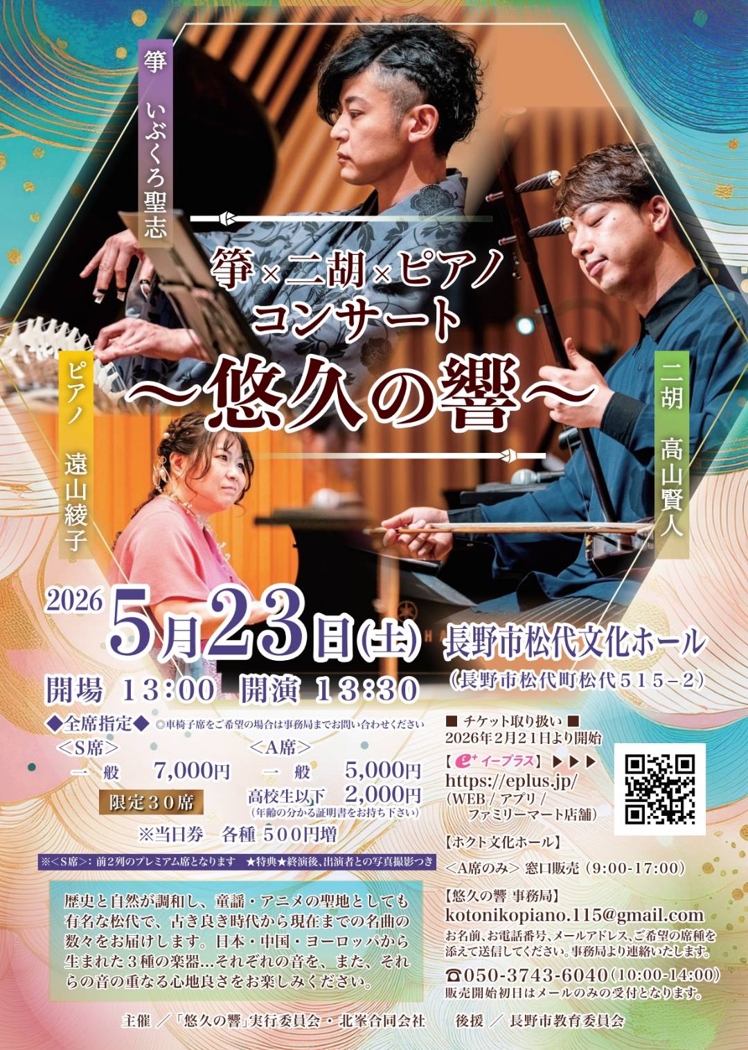 - お問い合わせ・ご予約は「悠久の響コンサート事務局」にお電話かメールをしてください。